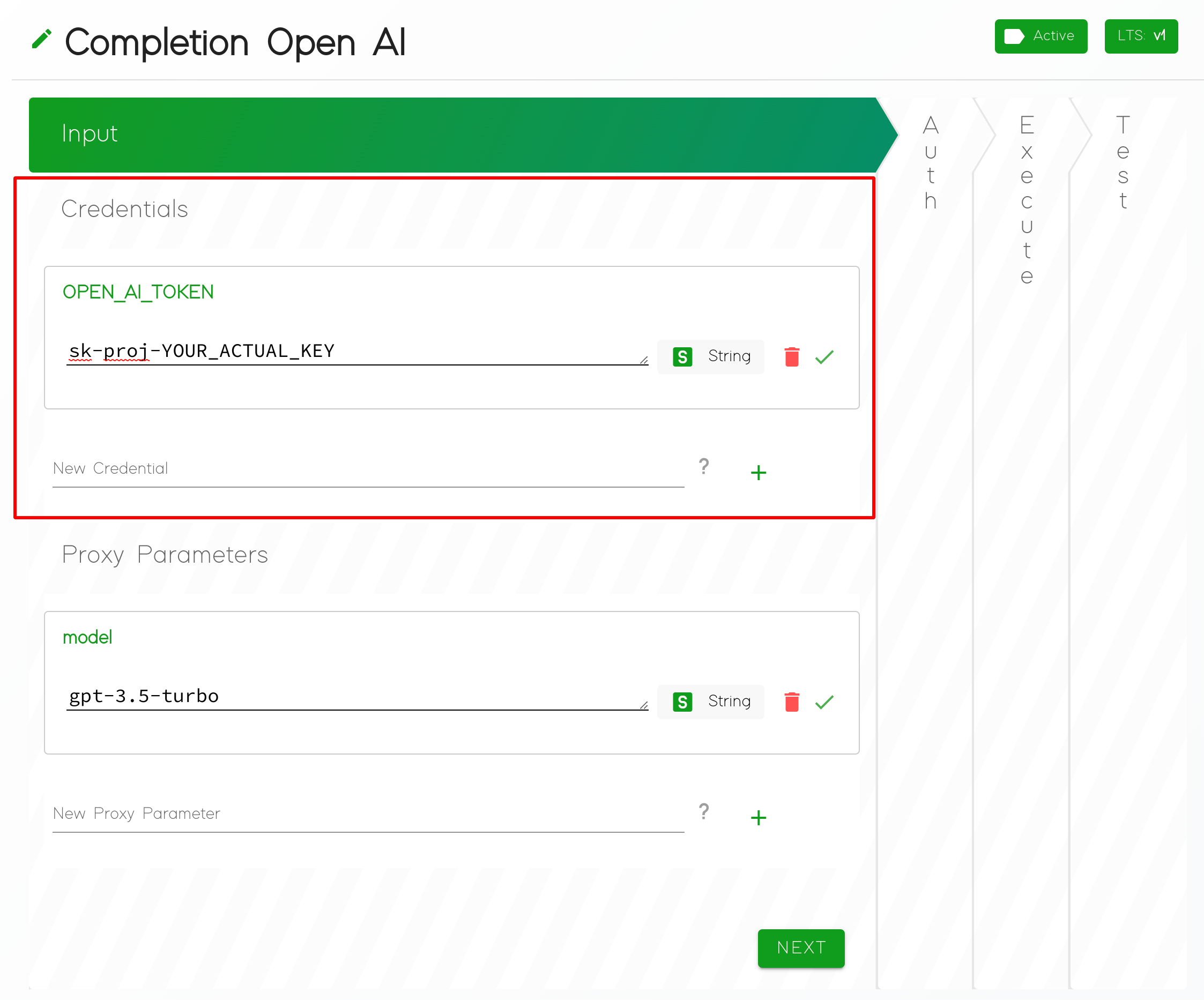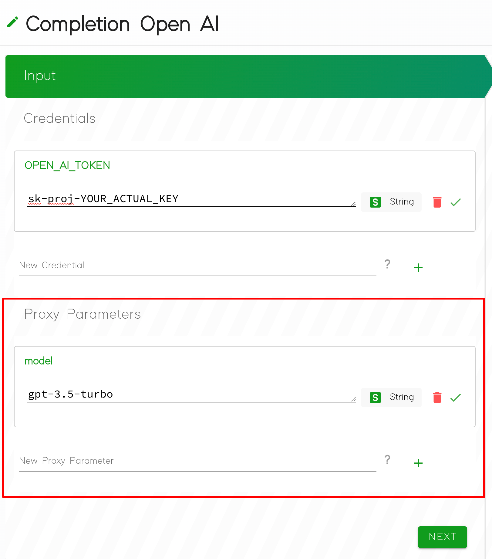The input parameters represents everything that should be passed to the API request during the execution. PRST Connector Allows to define 2 types of Input Parameters: Credentials and Proxy Parameters.