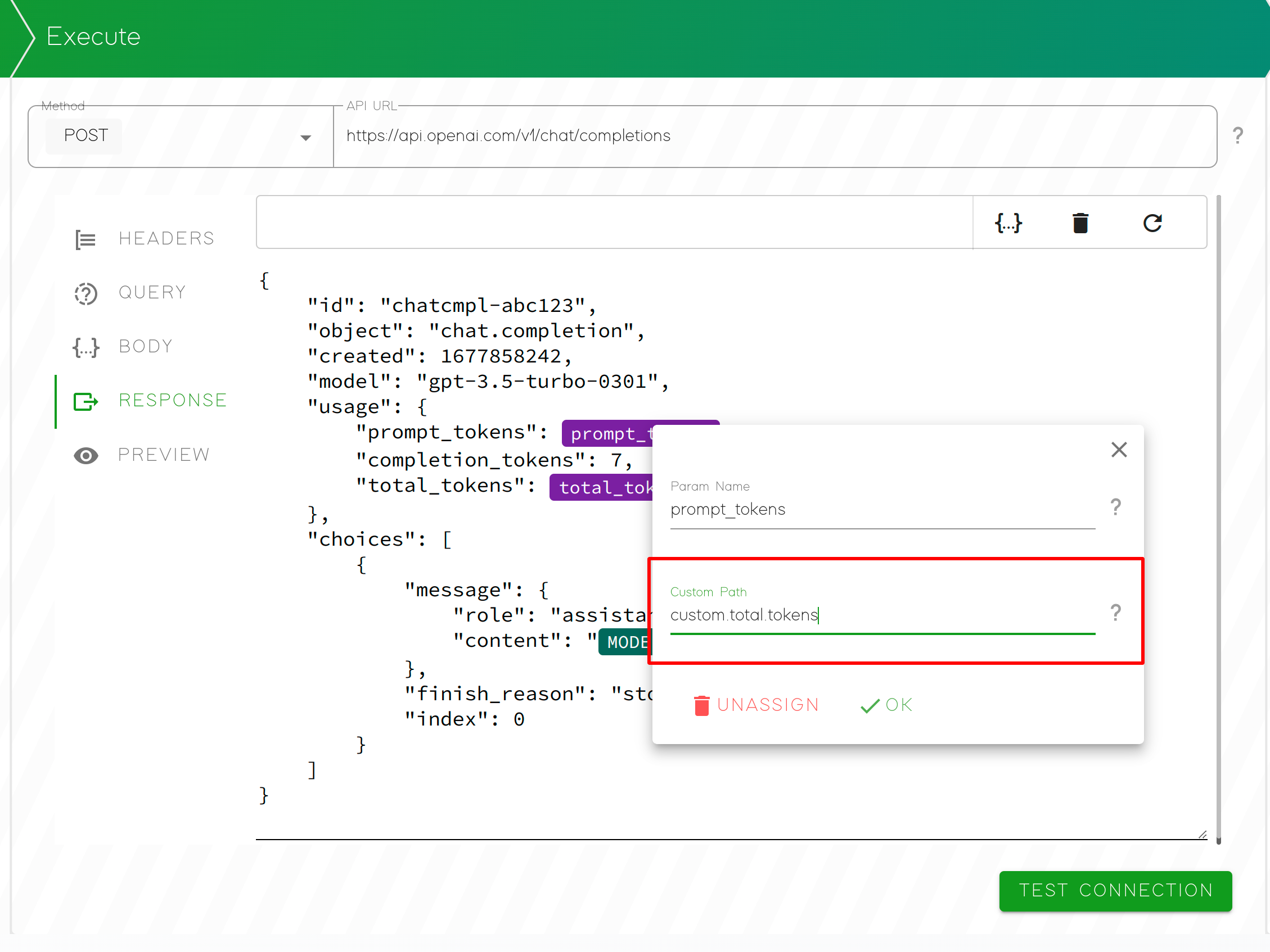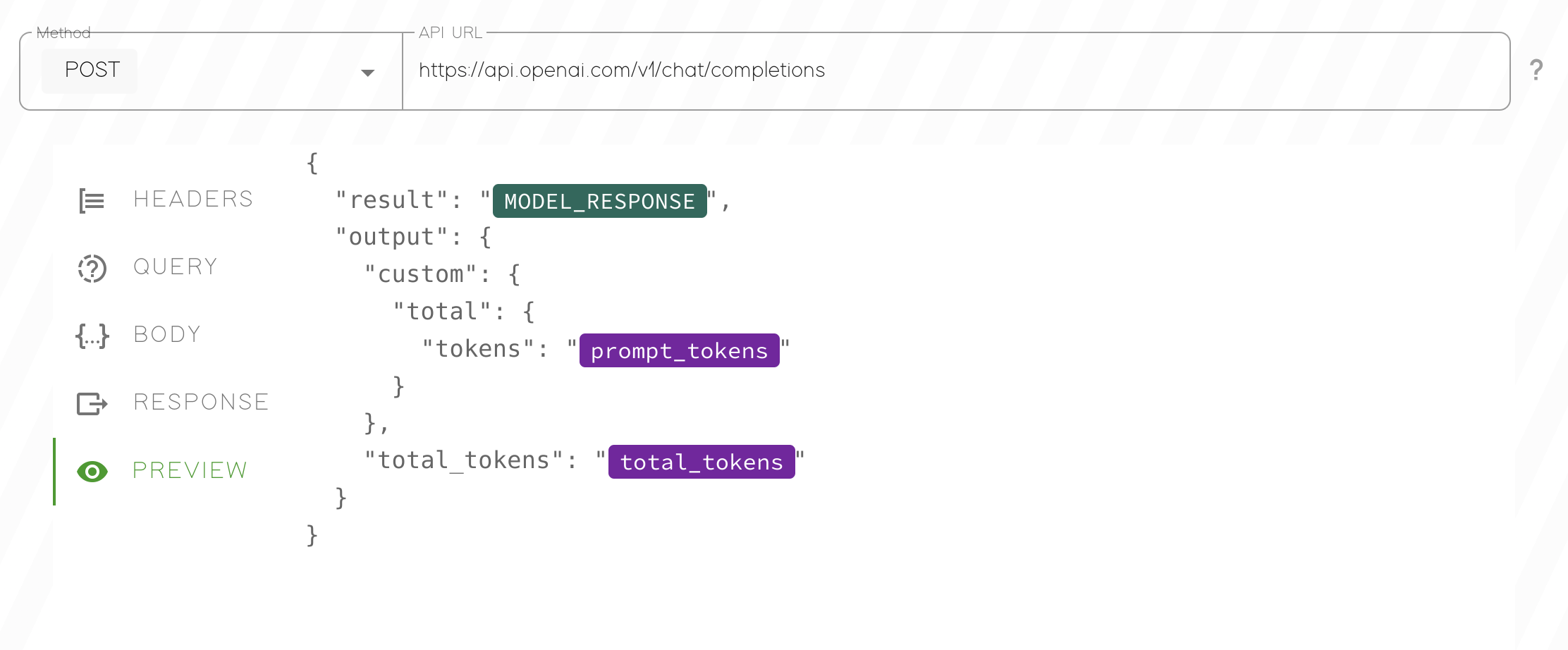 In example below the parameter prompt_tokens will be passed to the custom path: "custom.total.tokens"